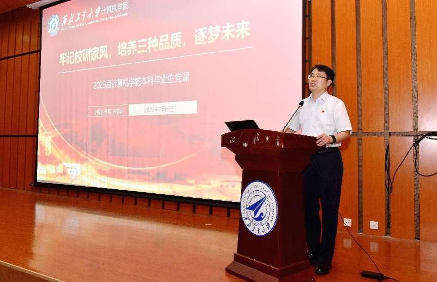 李春科为毕业生上离校前最后一堂思政课和微党课。祝贺本届学子顺利完成学业,叮嘱大家作为西工大计算机学子,要牢记校风校训和家风,公诚勇毅,永矢毋忘,三实一新,镌刻心田;传承和发扬老一辈计算机人敢为人先、自主创新的优良传统,新走入职场,重点培养好自己的实干、远见、自省三个重要品质,01创新、计算报国,智创未来。