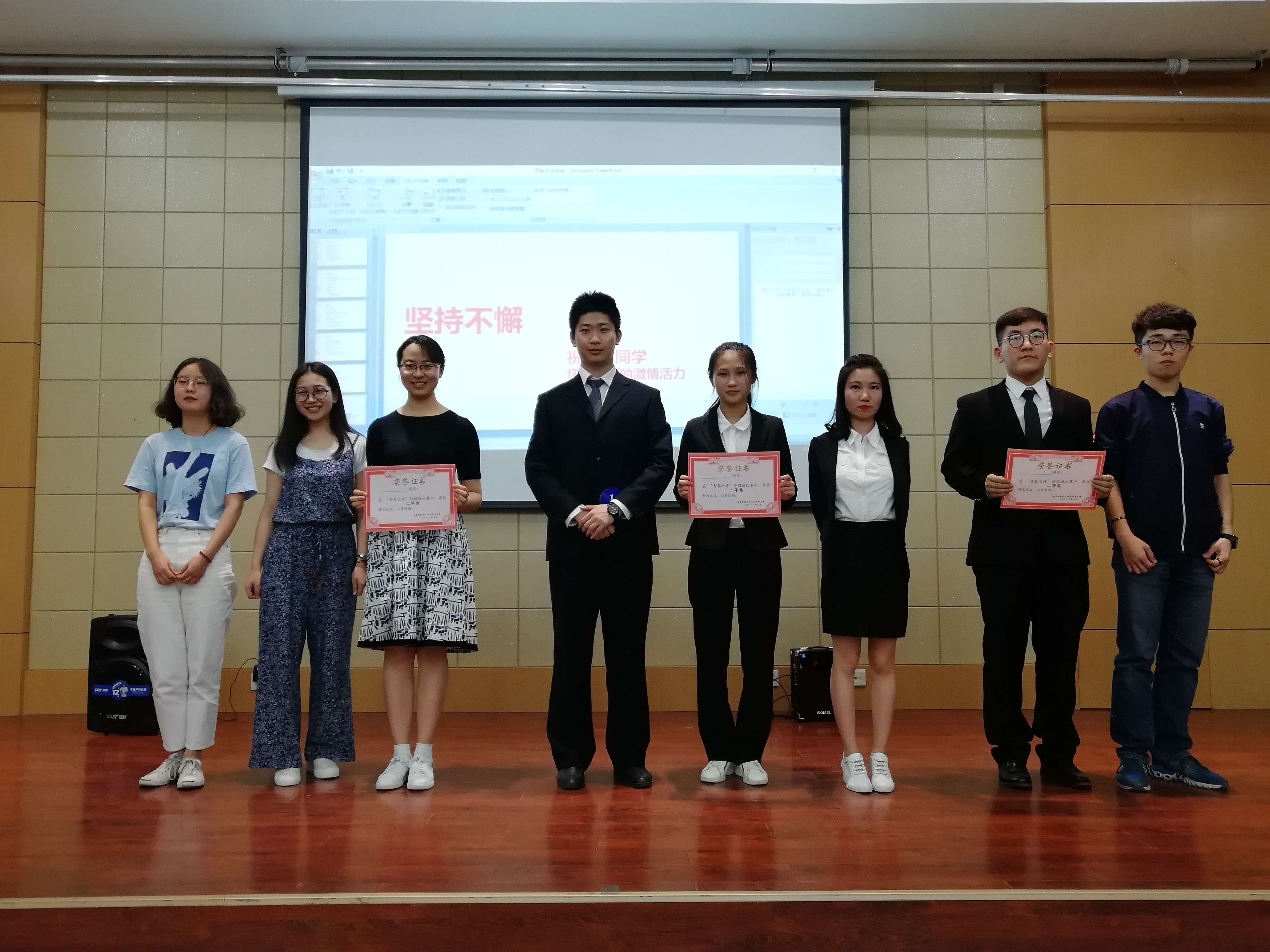 比赛期间,主持人还就相关诗歌、学校历史及党的十九大相关问题与同学们进行了积极热烈的互动。