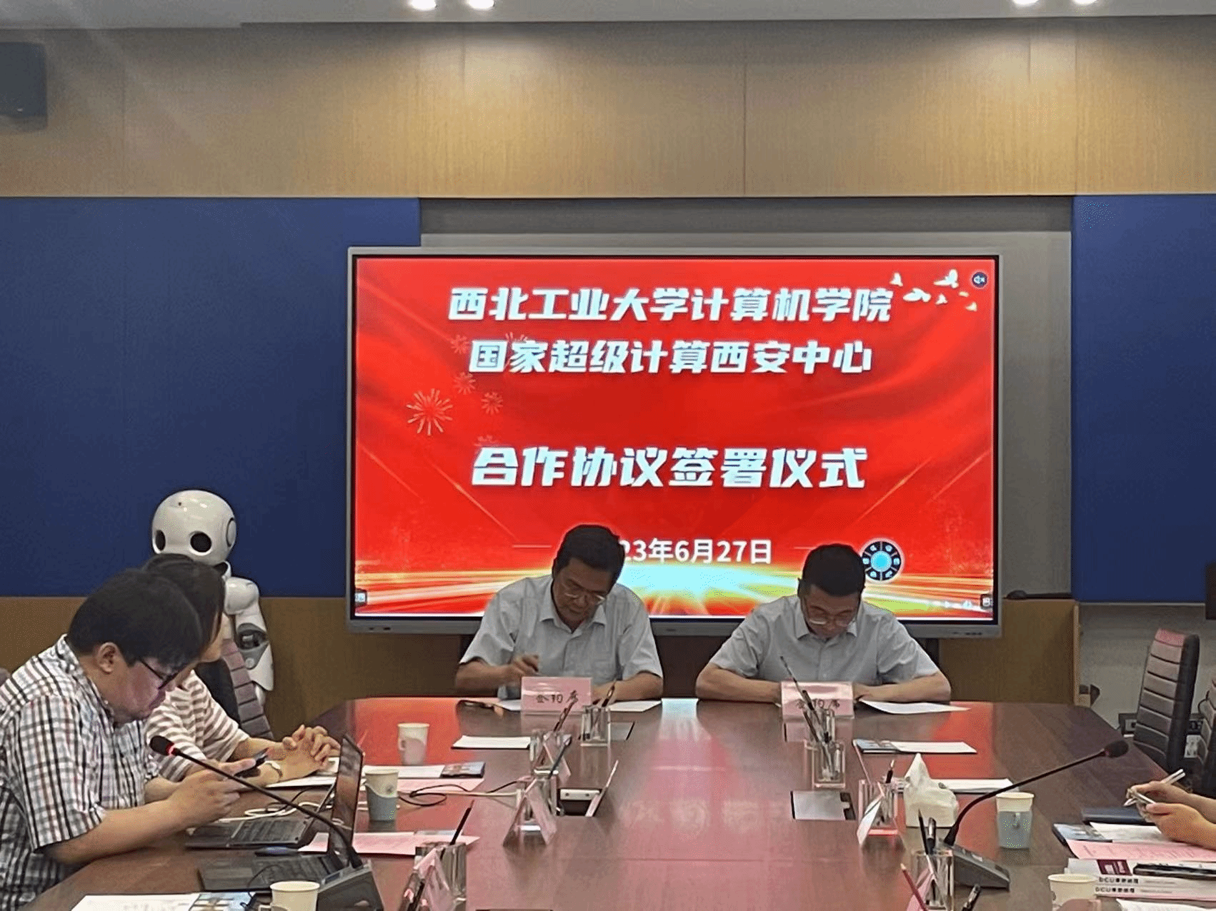 6月27日下午,星空体育官网登录平台与国家超算西安中心在学院105会议室举行了合作协议签署仪式。计算机学院副院长邓磊、空天地海大数据国家工程实验室副主任王鹏教授、高性能中心李秀春副教授、国家超算西安中心总经理袁玉峰、科教事业部孙雨凡、行业经理张帆、雷详出席了活动。