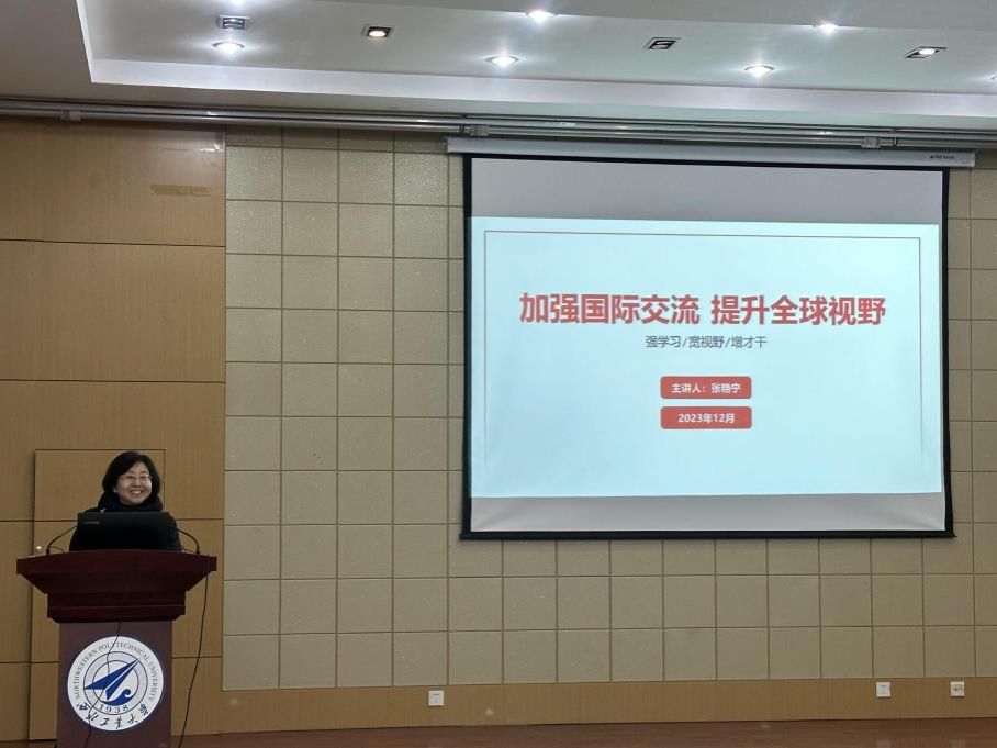 张艳宁以《加强国际交流 提升全球视野》为题,结合党的二十大精神、习近平总书记在中共中央政治局第五次集体学习上的重要讲话,从新时代教育国际合作交流概况、高等教育对外开放相关政策、学校国际交流合作主要成效、青年大学生全球视野提升等方面阐释了强学习、宽视野、增才干的主题思想。