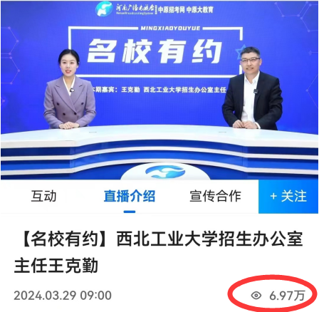 在直播过程中,王克勤介绍了学校的“总师型”人才培养理念、育人成效、毕业生就业、师资队伍、专业特色及近年录取情况。同时强调学校拥有一流的师资力量和科研实力,注重学生的综合素质和特长发展,为学生提供了广阔的发展空间。在直播最后,与观众进行互动,耐心解答关于招生的热点问题,勉励同学们珍惜时光,不负韶华,努力学习,争取成为西北工业大学这个大家庭中的一员。