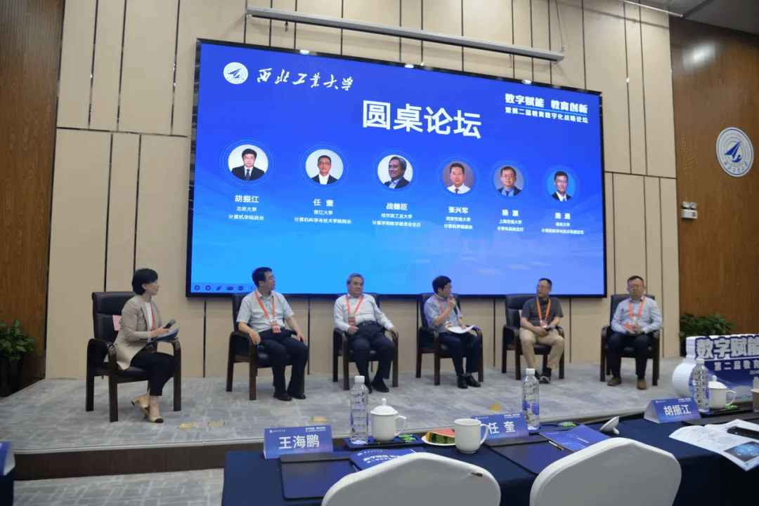 北京大学计算机学院院长胡振江、浙江大学计算机科学与技术学院院长任奎、哈尔滨工业大学计算学部教学委员会主任战德臣、上海交通大学计算机系副主任骆源、西安交通大学计算机科学与技术学院副院长唐亚哲在尚学群的主持下进行圆桌论坛,就如何落实国家教育数字化战略、加快教育创新与人工智能、大模型、元宇宙等技术的深度融合进行深入研讨,汇聚力量、形成共识,共同探索教育数字化未来发展方向。