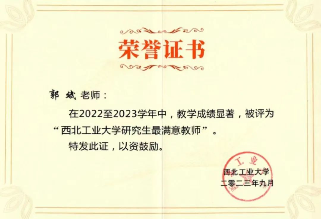 近几年来,郭老师先后有8位指导的研究生获得国家奖学金,数量在计算机学院名列前茅;指导研究生多次获得校“博士创新基金”、“校企合作基金”、“创意创新种子基金”等支持,先后有5名同学毕业论文入选“西北工业大学优秀硕士学位论文”,1名同学毕业论文入选“西北工业大学优秀博士学位论文”,13名同学入选西工大优秀硕士毕业生,1名同学入选西工大优秀博士毕业生。