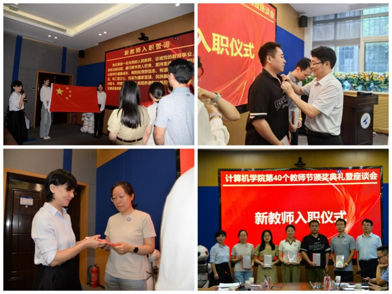 会上,还举行了新教师集体欢迎和宣誓仪式。书记院长为近一年来新加入计算机学院大家庭的每位教师佩戴院徽,并为每人送上《科技强国——35位科学家的信仰选择》一书。刘琰、韩淑捷、潘雨黛等新入职教师相继发言,表达了他们将坚守教育初心、勇担时代使命,为党和国家培养优秀人才的坚定决心。