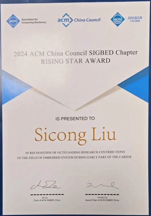 近日,计算机学院人机物融合智能计算团队青年教师刘思聪副教授先后荣获国际会议ACM SenSys 2024 最佳论文提名奖和ACM SIGBED 2024中国新星奖。
