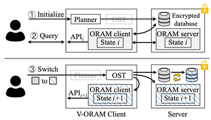 本篇论文针对实际应用中的动态工作负载问题,提出了一种自适应的动态ORAM设计——V-ORAM。该设计能够根据用户的工作负载特征,自适应地选择最优的ORAM方案,并在常数开销下安全地在三种典型的ORAM方案之间转换,以满足高吞吐量、低延迟和并行访问等不同需求。此外,论文识别出转换过程中可能存在的两类信息泄露风险,并提出了安全服务转换协议(OST协议),在常数开销下有效消除这些泄露,进一步提升了V-ORAM的安全性。