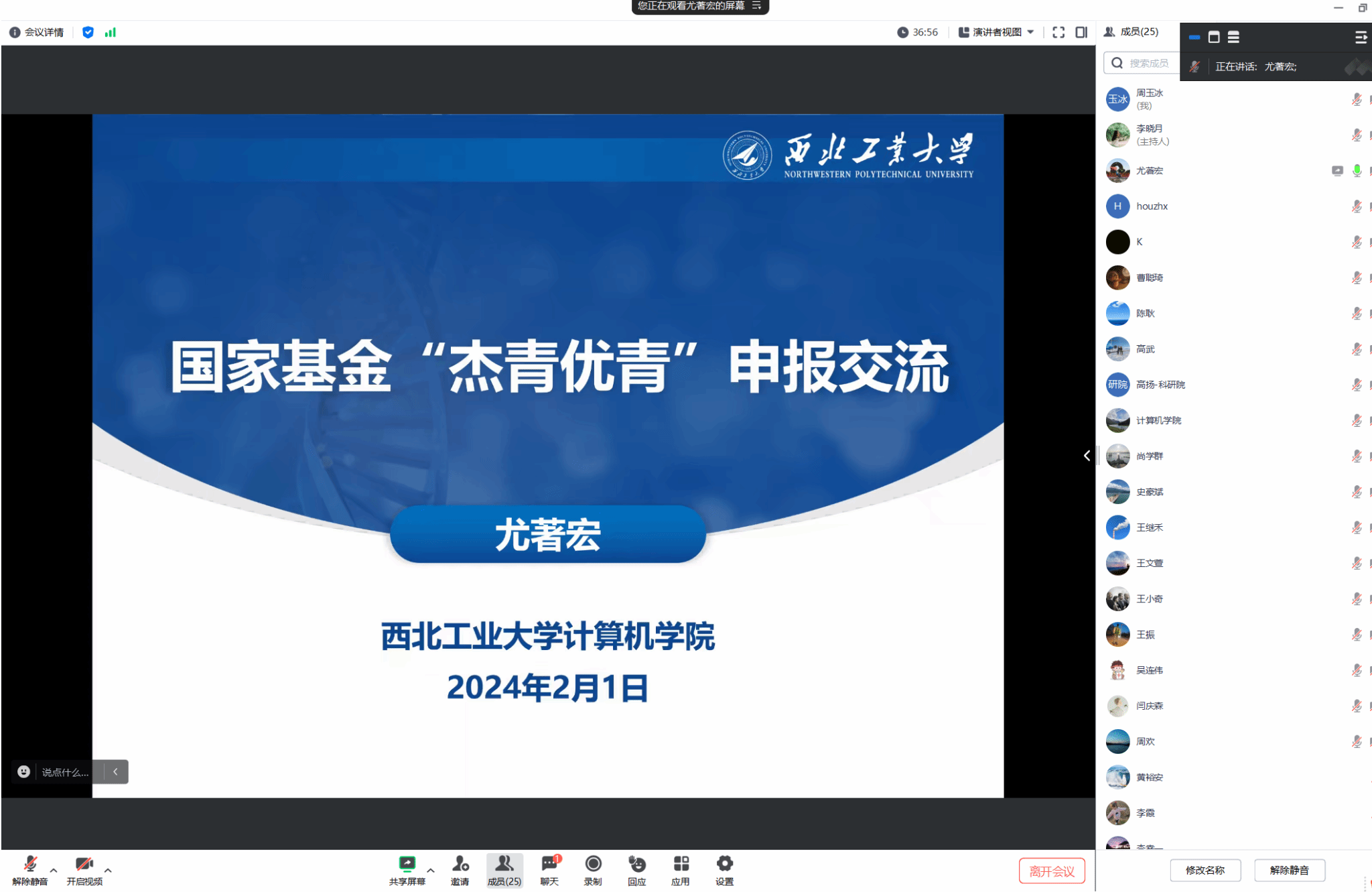 聚力学校“127”发展目标,进一步强化基础研究,实现“0到1”与“1到0”双向发力,21下午,计算机学院举办召开国家自然基金杰青优青申报辅导交流会,尚学群院长史豪斌副院长科学技术研究院基础办高扬主任以及本年度申请国家自然科学基金杰青优秀青年科学基金项目的全体教师参加了本次经验交流会会议史豪斌副院长主持。