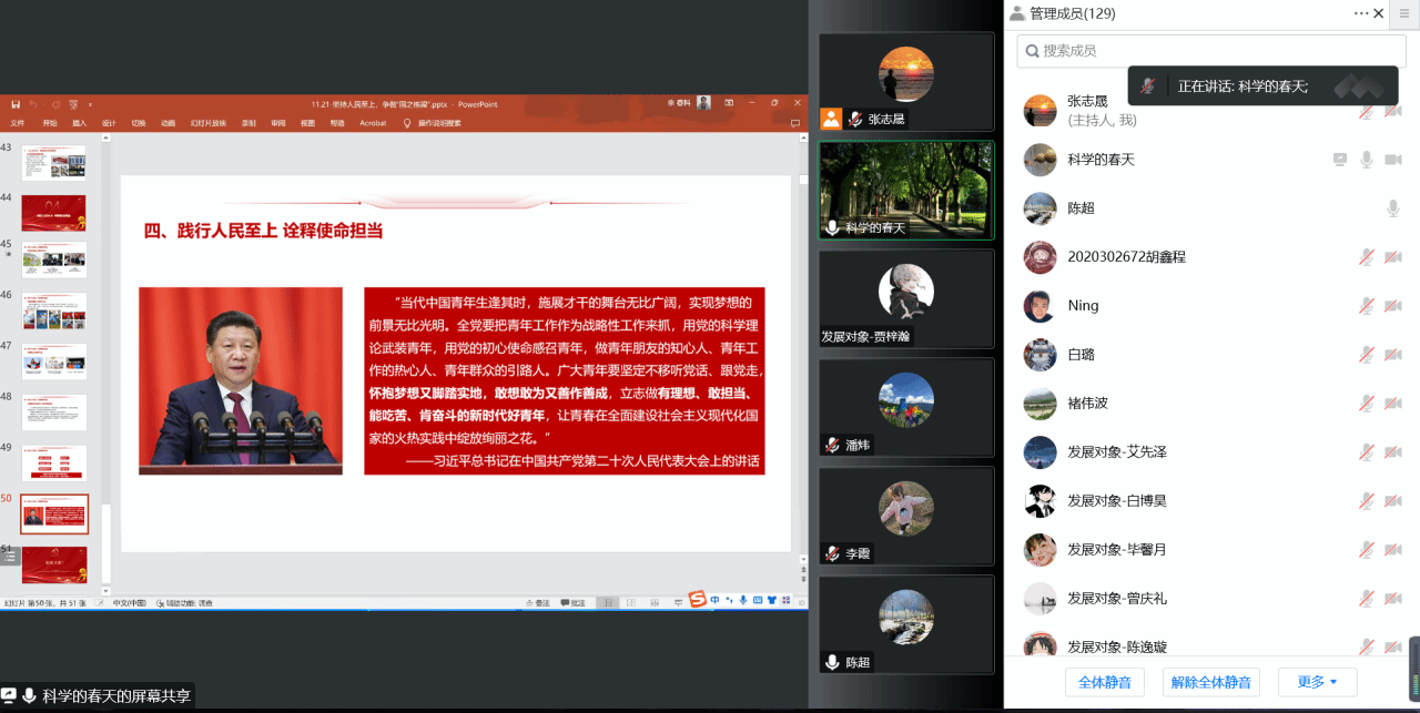 近期,学习贯彻和宣讲党的二十大精神正在计算机学院迅速开展之中。11月21日晚,学院党委书记李春科以“坚持人民至上,争做国之栋梁”为主题,为学院近200名师生宣讲二十大精神和讲授专题党课。本次宣讲也是计算机学院二十大精神学习系列报告第四讲,会议以线上形式举行。